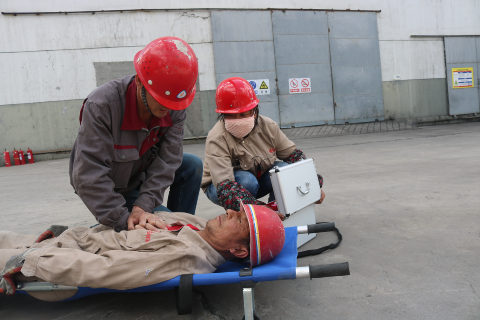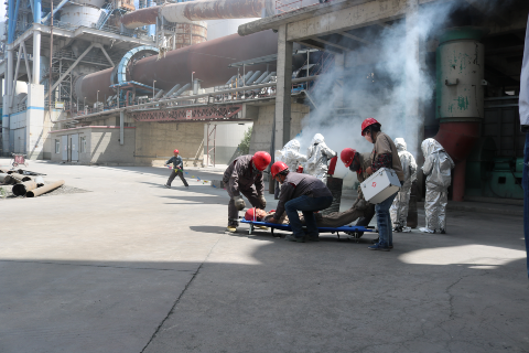 此次演練由生產(chǎn)部主任王克峰擔任救援總指揮,并設立安全警戒、水電控制、消防滅火、疏散搶救、醫(yī)療救護、后勤保障共6個救援小組,并設專人任組長。上午9:30分,全體演練人員在燒成車間窯中空場進行集合。王克峰總指揮首先進行了演練動員,宣布了本次演練的組織機構人員名單、職責及演練要求。隨著王克峰宣布演練正式開始,各組人員嚴格按照救援方案展開演練。安全警戒組和水電控制組立即設立警戒帶和切斷災情區(qū)域及相關設施電源,消防滅火組迅速用滅火器對火災現(xiàn)場進行緊急滅火,疏散搶救組將災區(qū)人員的重要物資進行轉移并將傷員救出,隨后醫(yī)療救護小組在現(xiàn)場對傷員進行了緊急救治,后勤保障組提供各項服務支持。各救援小組分工明確,反應迅速,配合緊密,僅用了5分鐘便成功撲滅火災將人員救出,在大家共同努力下此次演練圓滿成功。