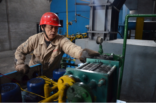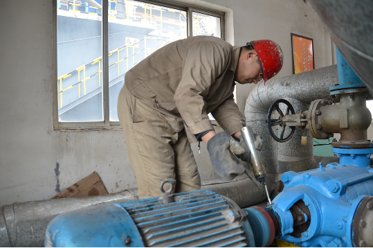 余熱發(fā)電中控員張明正在對真空泵進(jìn)行壓油