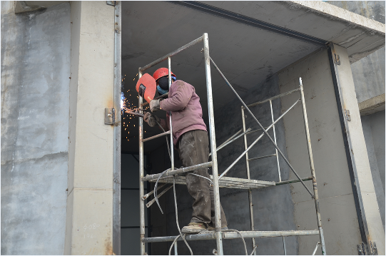 維修工王克兵正在焊制倉庫門框