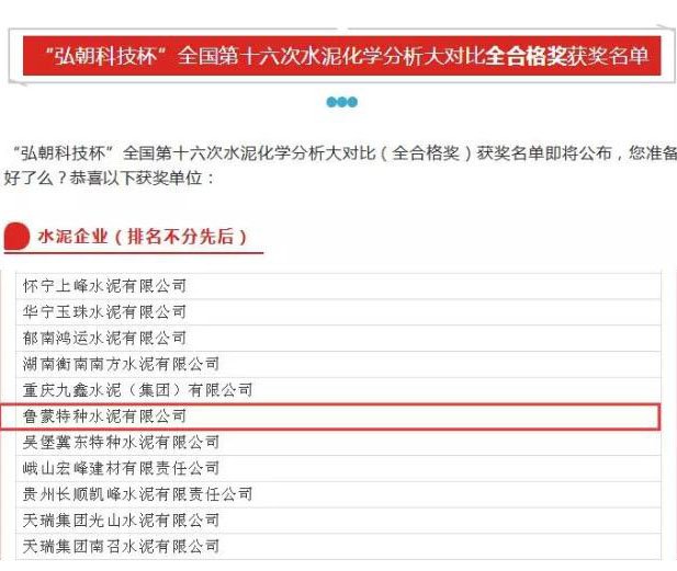 魯蒙水泥榮獲全國第十六次化學(xué)分析大對(duì)比“全合格”獎(jiǎng)項(xiàng)