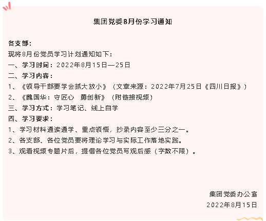 【通知】集團黨委8月份學(xué)習(xí)通知