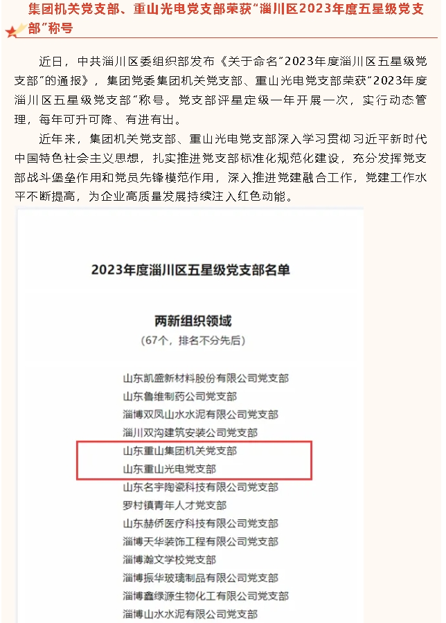 【黨建】集團機關黨支部、重山光電黨支部榮獲“淄川區(qū)2023年度五星級黨支部”稱號
