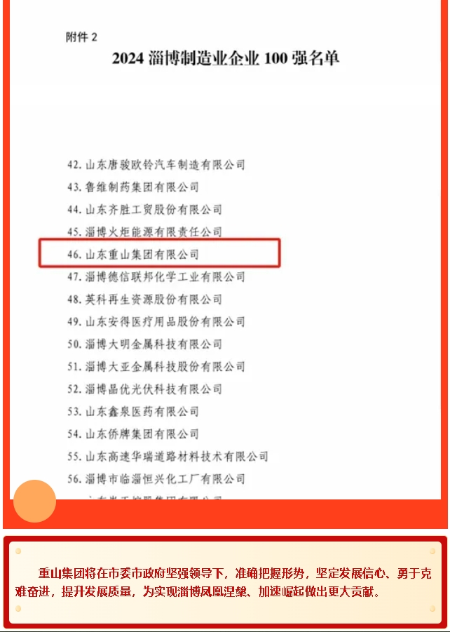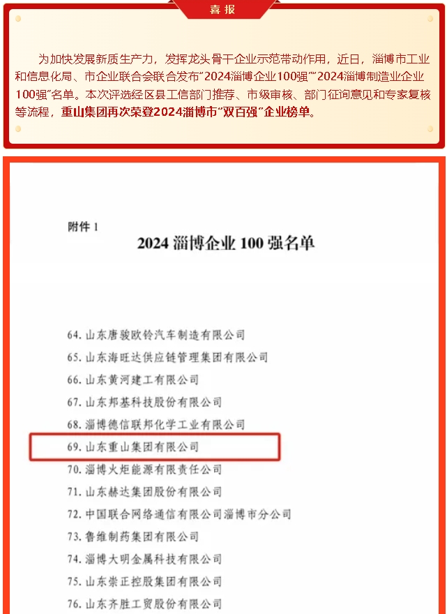 【頭條】重山集團(tuán)榮登2024淄博“雙百?gòu)?qiáng)”企業(yè)榜單