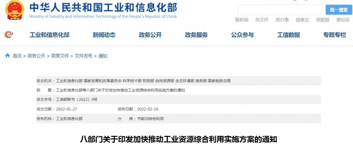 工業(yè)和信息化部、國家發(fā)展和改革委員會、科學(xué)技術(shù)部、財政部、自然資源部、生態(tài)環(huán)境部、商務(wù)部、國家稅務(wù)總局等八部門近日聯(lián)合印發(fā)《關(guān)于加快推動工業(yè)資源綜合利用的實(shí)施方案》,明確到2025年,鋼鐵、有色、化工等重點(diǎn)行業(yè)工業(yè)固廢產(chǎn)生強(qiáng)度下降,大宗工業(yè)固廢的綜合利用水平顯著提升,再生資源行業(yè)持續(xù)健康發(fā)展,工業(yè)資源綜合利用效率明顯提升。力爭大宗工業(yè)固廢綜合利用率達(dá)到57%,其中,冶煉渣達(dá)到73%,工業(yè)副產(chǎn)石膏達(dá)到73%,赤泥綜合利用水平有效提高。主要再生資源品種利用量超過4.8億噸,其中廢鋼鐵3.2億噸,廢有色金屬2000萬噸,廢紙6000萬噸。工業(yè)資源綜合利用法規(guī)政策標(biāo)準(zhǔn)體系日益完善,技術(shù)裝備水平顯著提升,產(chǎn)業(yè)集中度和協(xié)同發(fā)展能力大幅提高,努力構(gòu)建創(chuàng)新驅(qū)動的規(guī)?;c高值化并行、產(chǎn)業(yè)循環(huán)鏈接明顯增強(qiáng)、協(xié)同耦合活力顯著激發(fā)的工業(yè)資源綜合利用產(chǎn)業(yè)生態(tài)。
