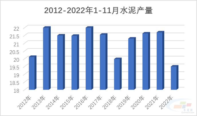 12月15日,國家統(tǒng)計局發(fā)布11月份經(jīng)濟數(shù)據(jù)。其中,2022年11月份,水泥產(chǎn)量1.92億噸,同比下降4.7%;1-11月份,水泥產(chǎn)量19.5億噸,同比下降10.8%。