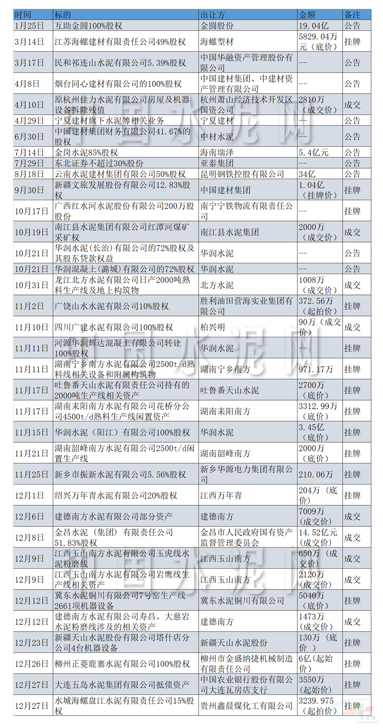 2022年水泥行業(yè)部分股權(quán)/資產(chǎn)轉(zhuǎn)讓情況