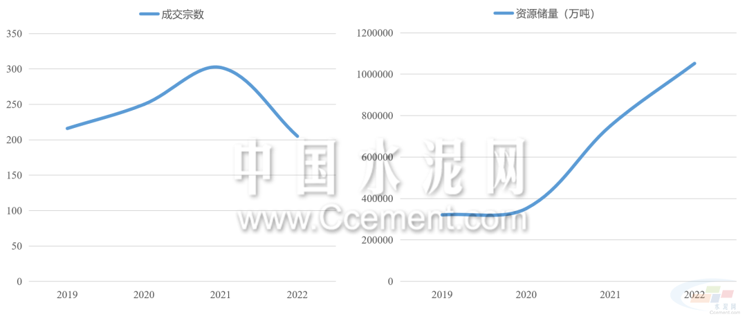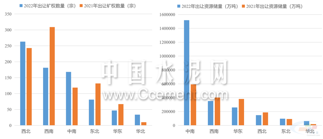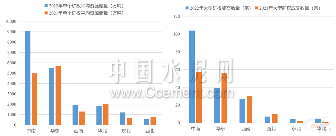 2022年礦權(quán)出讓呈現(xiàn)數(shù)量減少,儲量增長的特點(diǎn)。據(jù)目前已公布的礦權(quán)成交結(jié)果來看,2022年共有774宗型砂石礦權(quán)成交,同比減少12%,共計(jì)出讓資源儲量243.7億噸,同比增長超40%。中南地區(qū)是出讓礦權(quán)資源儲量最高的區(qū)域,占全國出讓資源儲量的六成以上,同比增長超150%。