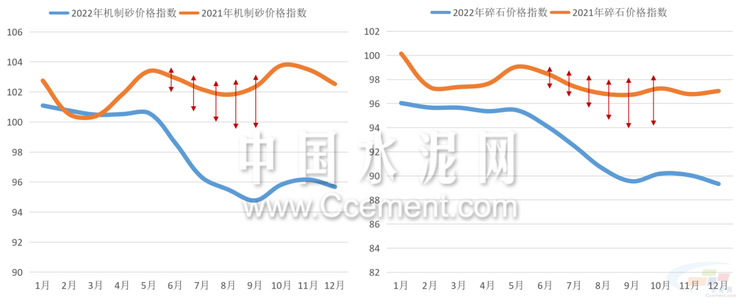 截至12月底,全國碎石價格指數(shù)報收88.07點(diǎn),同比下降9.07%。全國機(jī)制砂價格指數(shù)報收94.38點(diǎn),同比下降7.49%。從機(jī)制砂均價來看,2022年砂石價格整體呈弱勢下跌趨勢,二季度中下旬后價格行情明顯走弱,4-10月的月均機(jī)制砂價格指數(shù)同比跌幅持續(xù)擴(kuò)大,四季度后價格反彈力度并不大。