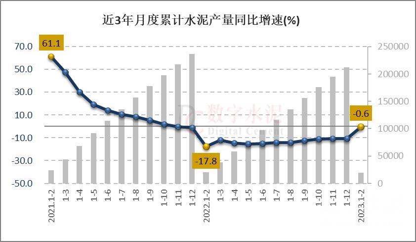 1-2月,全國累計水泥產(chǎn)量1.99億噸,同比下降0.6%,降幅較去年同期收窄17.2個百分點。