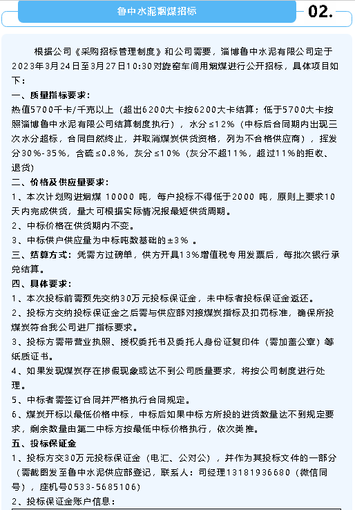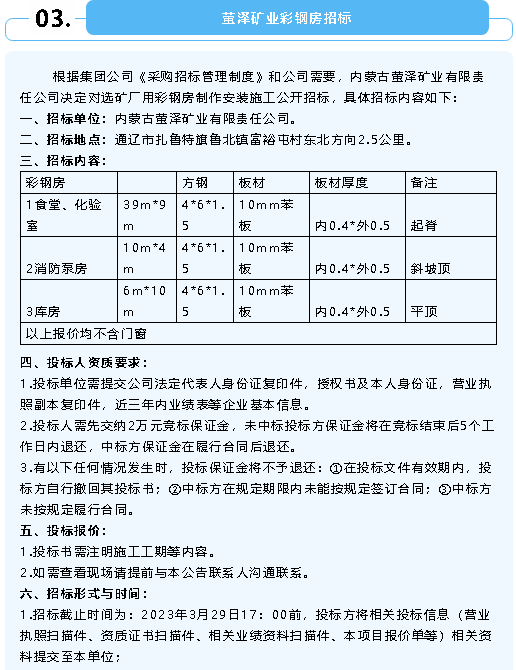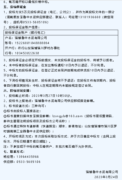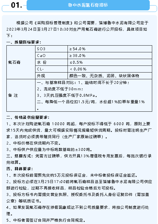 【招標(biāo)公告】魯中水泥氟石膏、煙煤招標(biāo)、螢澤礦業(yè)彩鋼房招標(biāo)、重山光電鋼材招標(biāo)
