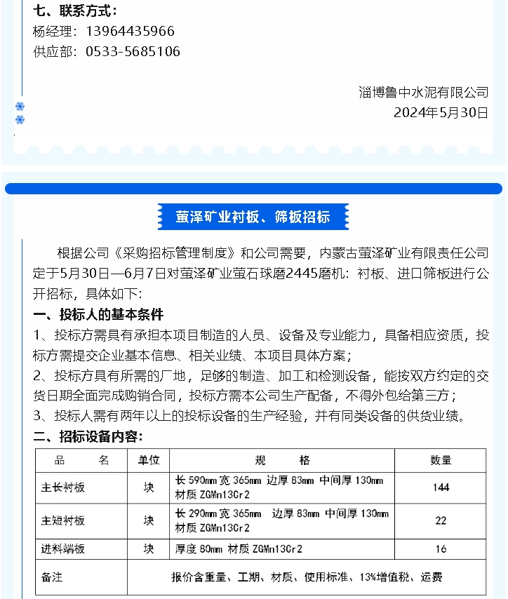 【招標公告】魯中水泥煙煤,螢澤礦業(yè)襯板、篩板招標