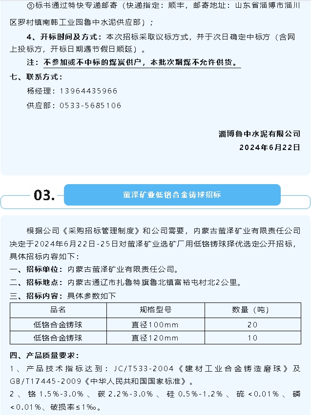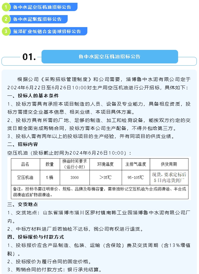【招標(biāo)公告】魯中水泥空壓機(jī)油、煙煤,螢澤礦業(yè)低鉻合金鑄球招標(biāo)