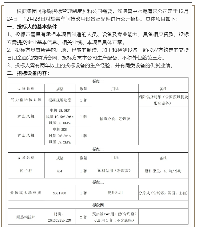 【招標(biāo)公告】魯中水泥