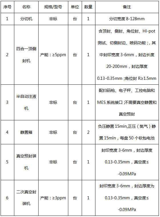 根據(jù)公司《采購招標管理制度》,山東重山光電材料股份有限公司定于10月20日—10月30日對高比能鋰氟化碳電池中試線軟包電池部分設備招標,具體要求如下:
