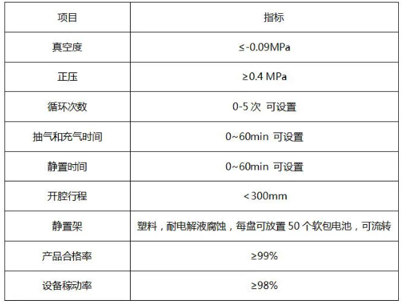 靜置箱用于鋰氟化碳注液后,使電池置于真空和正壓狀態(tài)下,使電解液快速均勻的滲透與電芯中。其主要工作流程是抽真空至-0.098MPa靜置15min,然后充正壓(氮氣)至0.4Mpa靜置15min,加快電解液滲透。