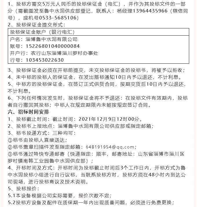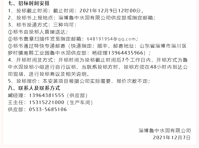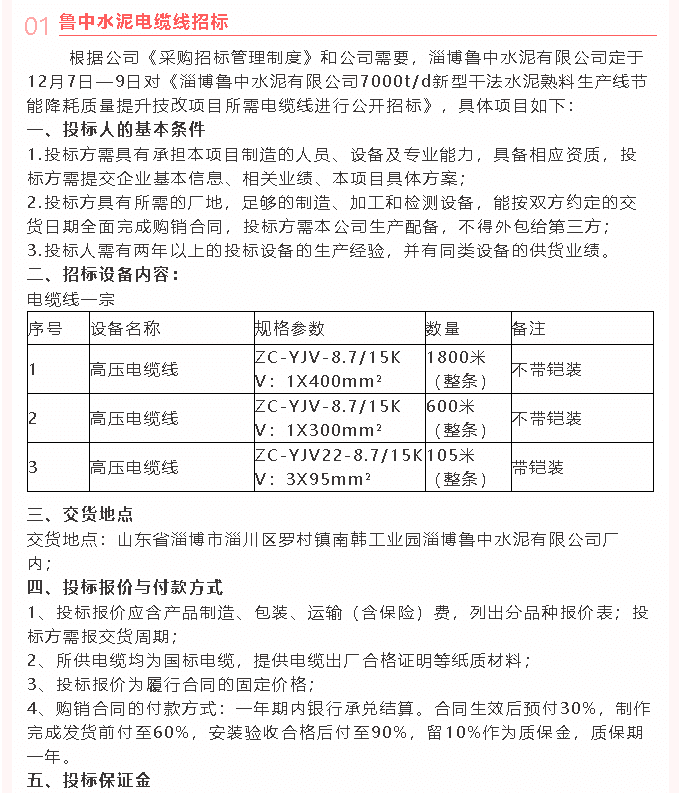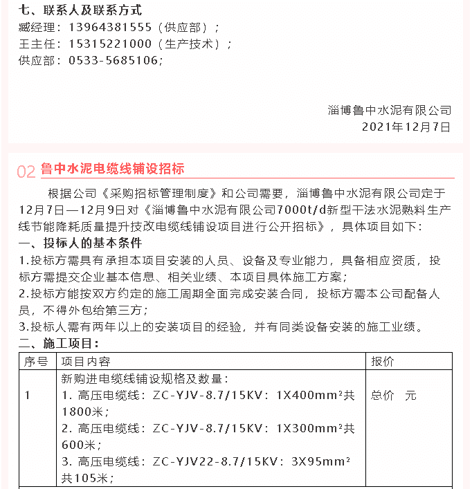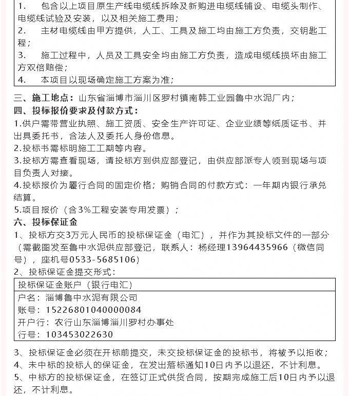 【招標(biāo)公告】魯中水泥電纜線、電纜線鋪設(shè)招標(biāo)