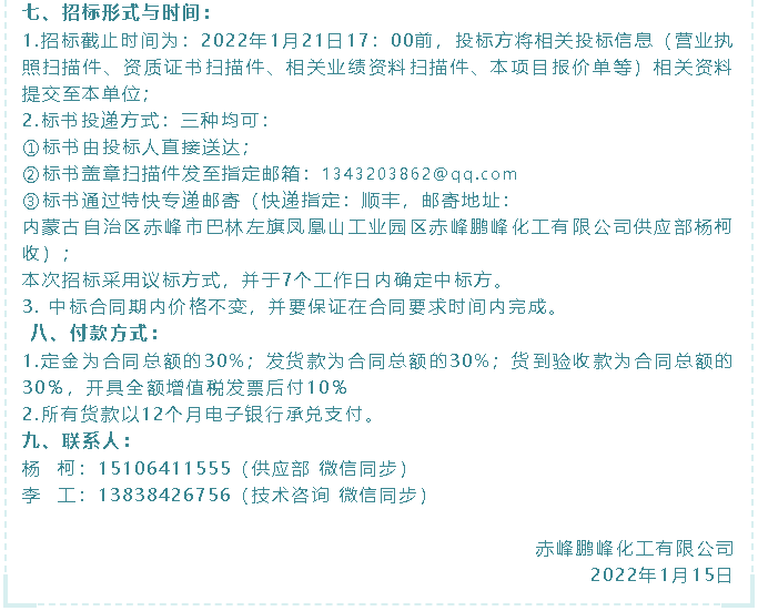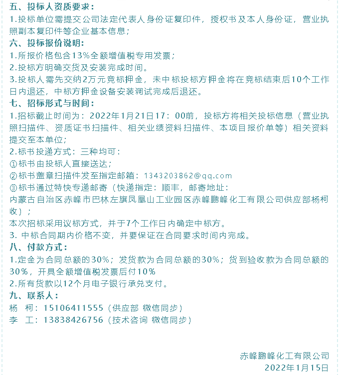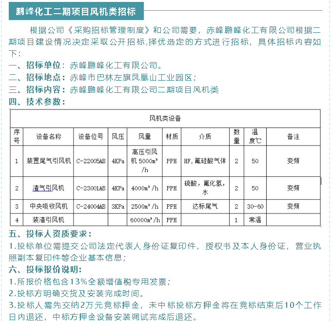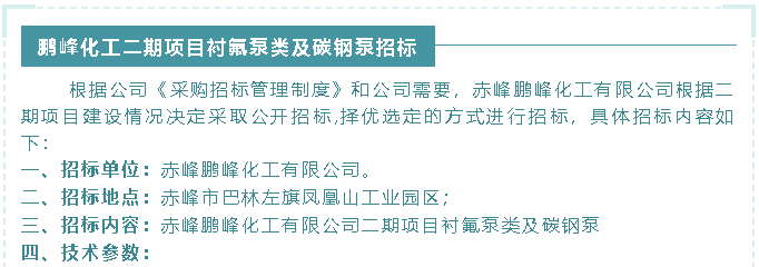 【招標(biāo)公告】?鵬峰化工二期項(xiàng)目襯氟泵類及碳鋼泵、風(fēng)機(jī)類招標(biāo)