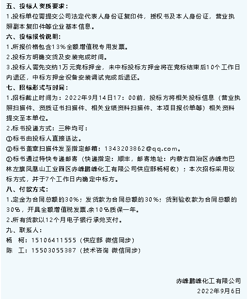 【招標(biāo)公告】鵬峰化工無水氟化氫運(yùn)輸、氣力輸送設(shè)備、有毒有害氣體報(bào)警器招標(biāo)